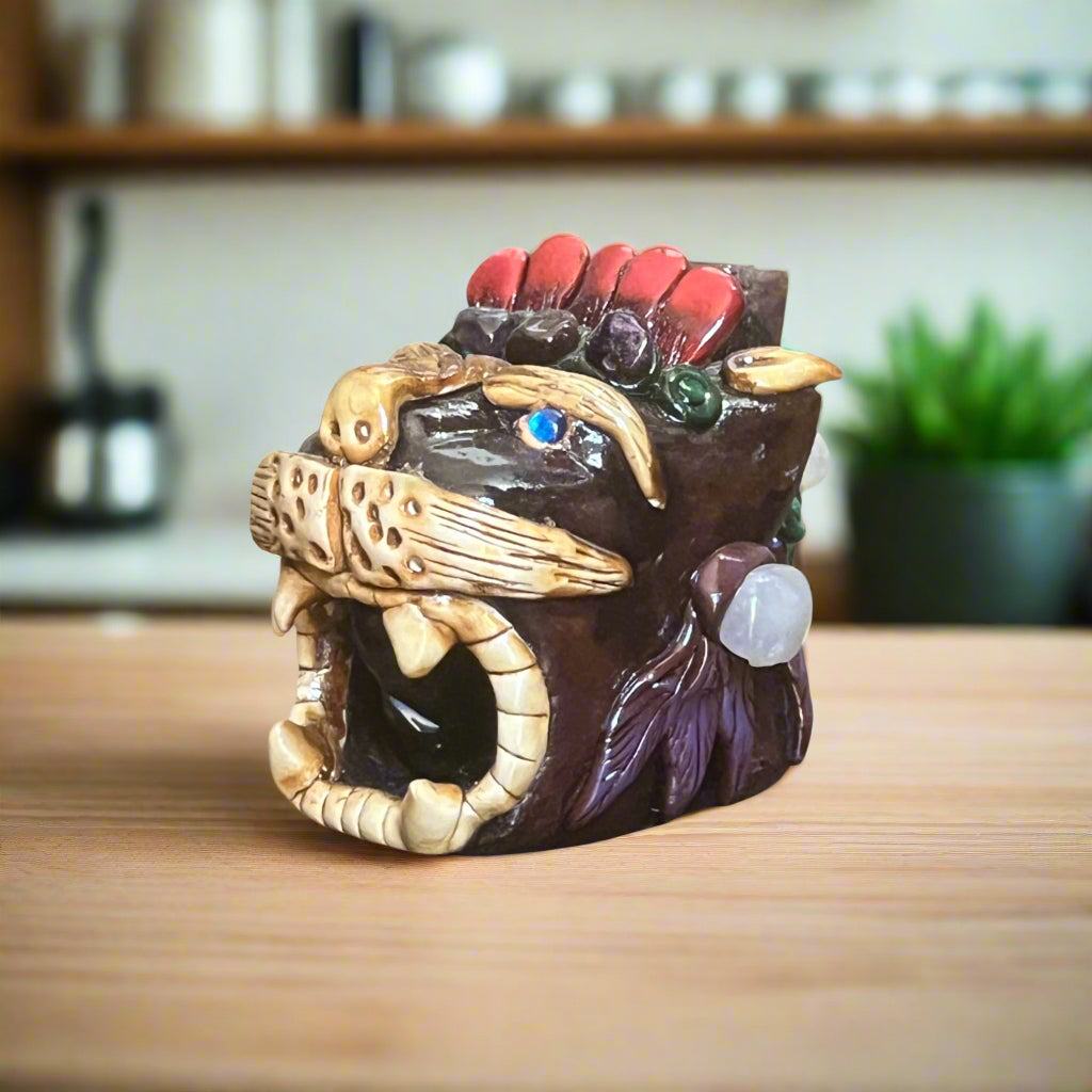 STYLE: Carefully sculpted to resemble a fierce creature’s head, this whistle features bold accents and intricate carvings in earthy brown tones, highlighted with red, ivory, and violet details that reflect traditional Aztec symbolism.