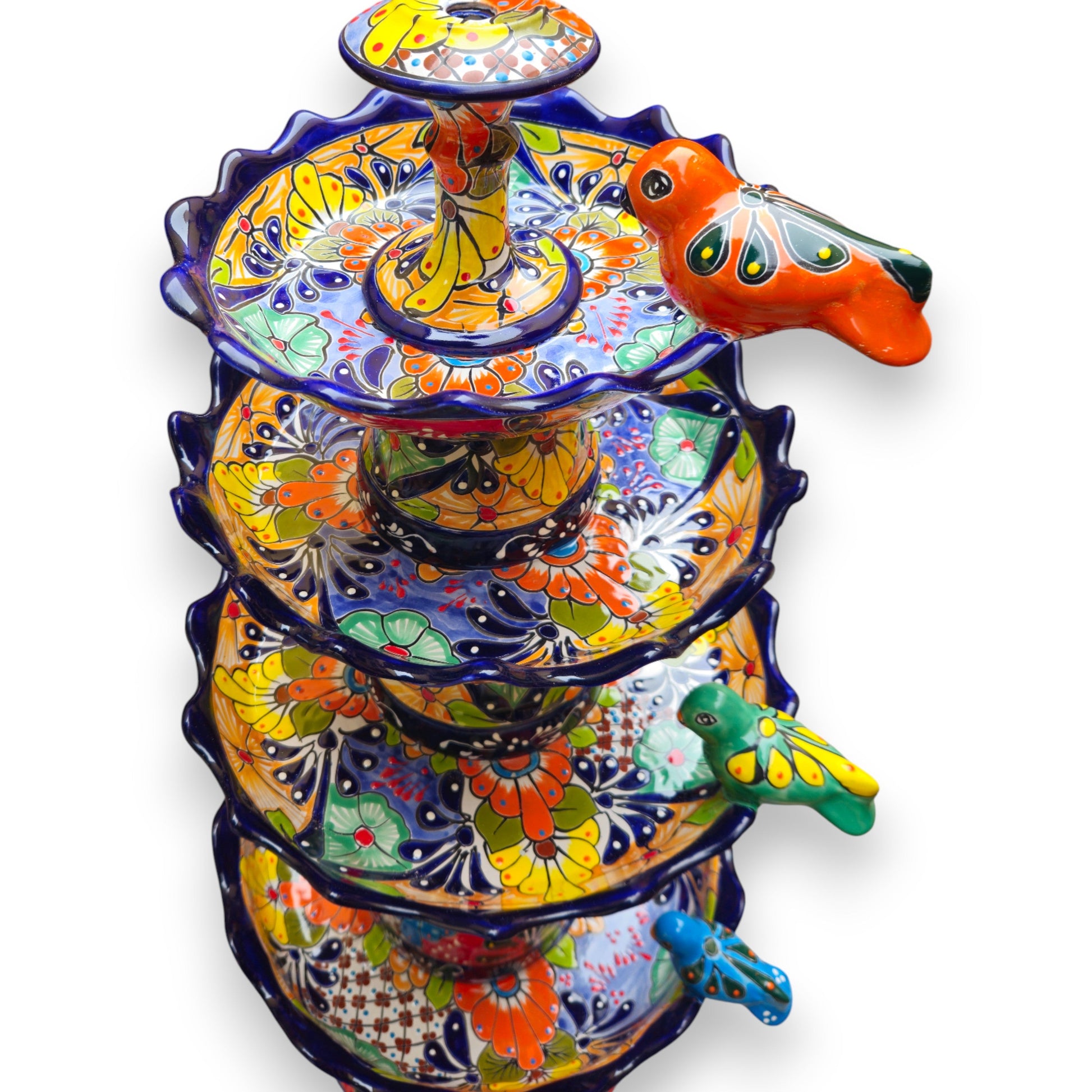 Style: This large multi-tiered fountain features vivid floral and geometric Talavera patterns in bright blues, yellows, reds, and greens, accented with sculpted birds and a scalloped rim for a lively, festive look.