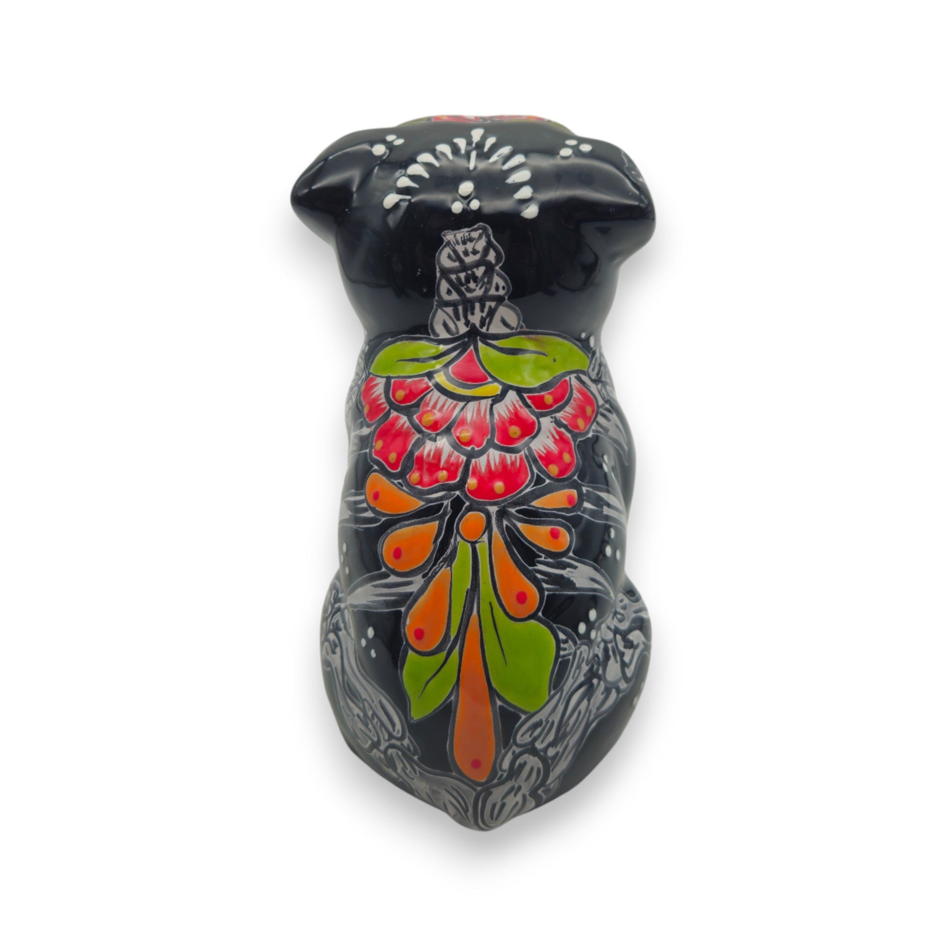 STYLE: This unique bulldog figurine features a striking black base with vibrant hand-painted details, including skeletal designs and vivid patterns on the face. The Day of the Dead motif celebrates Mexican heritage with bold flair and personality.
