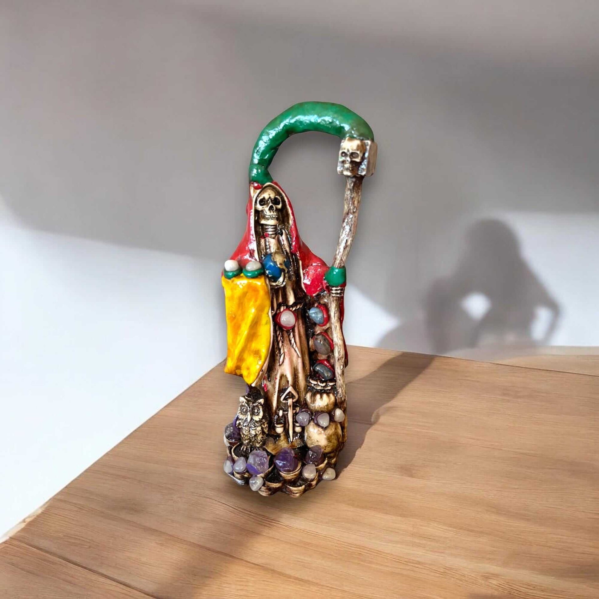 STYLE: This sculpture features a skeletal figure cloaked in vibrant red, yellow, and green robes, with gemstone-like accents and a long curved scythe topped with a skull. The base is adorned with stones, owls, and symbolic details, blending Aztec and spiritual elements in a dramatic, eye-catching design.