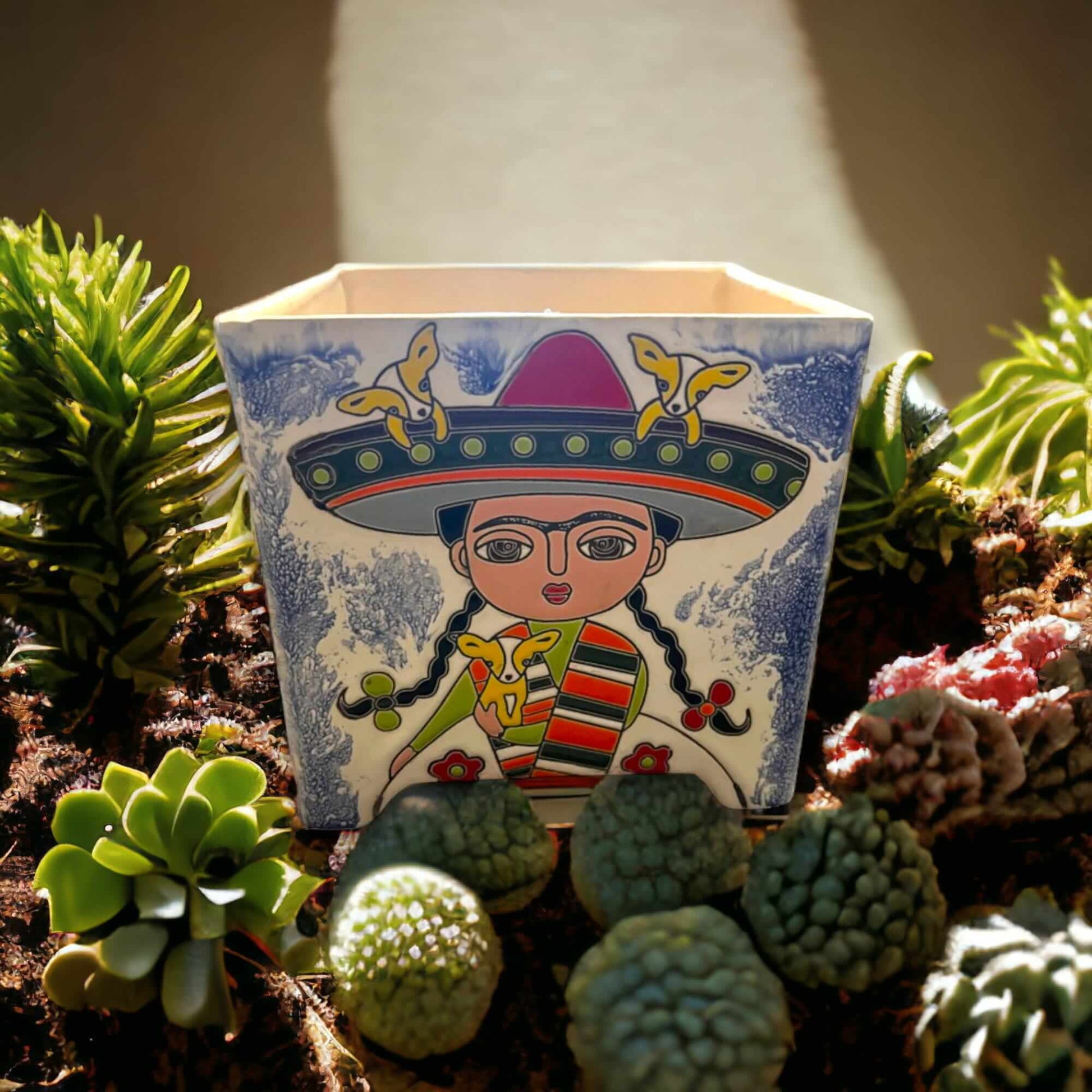 Add a burst of color and culture to your space with this hand-painted Frida Kahlo Talavera flower pot. Handcrafted by skilled artisans in Mexico, this vibrant square planter blends traditional artistry with modern folk charm, making it a standout piece for any home or garden.