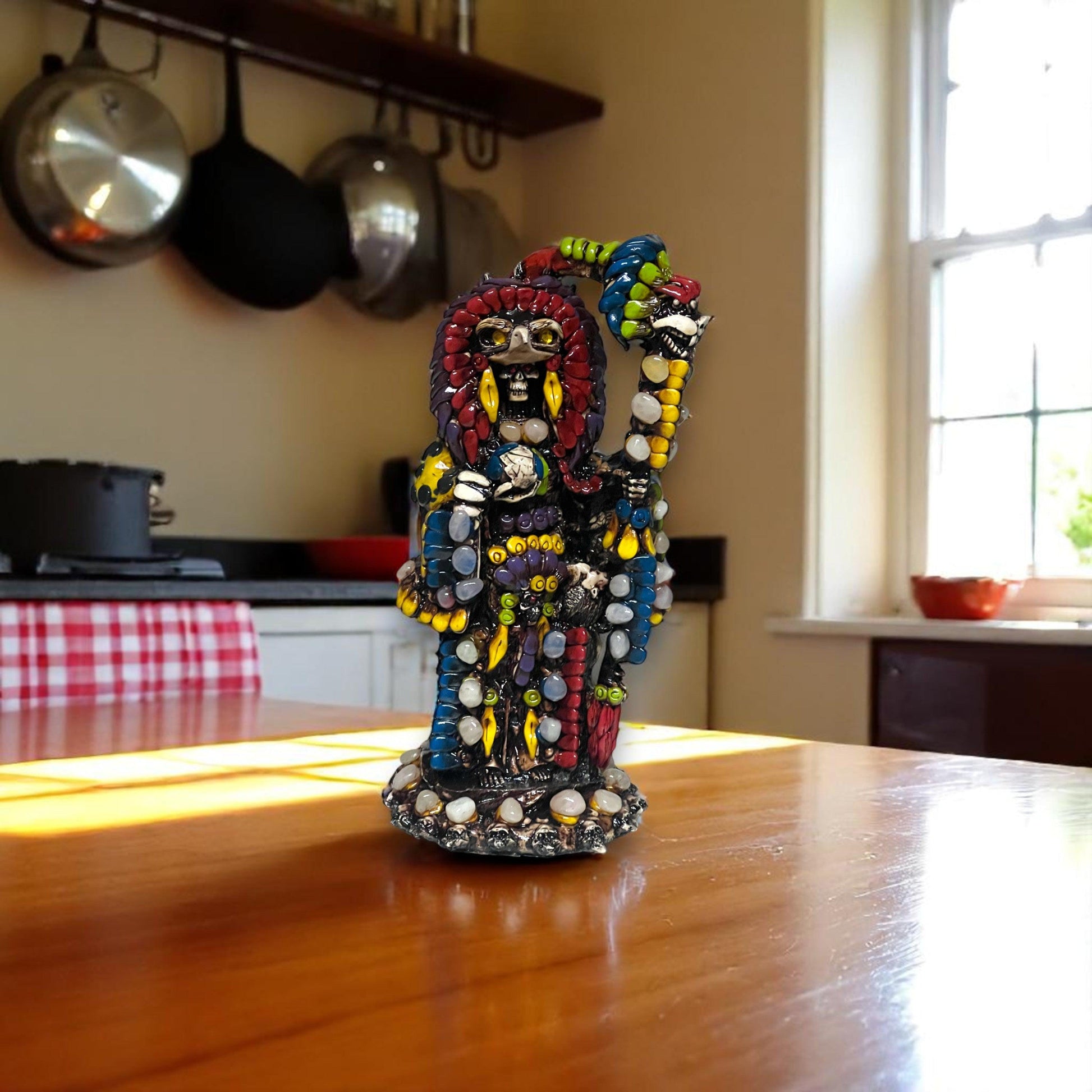 STYLE: This powerful figure showcases intricate hand-painted patterns in deep reds, blues, yellows, and greens, accented with faux gems and a serpent-wrapped staff. It's a vivid tribute to Aztec warrior symbolism and folklore.
