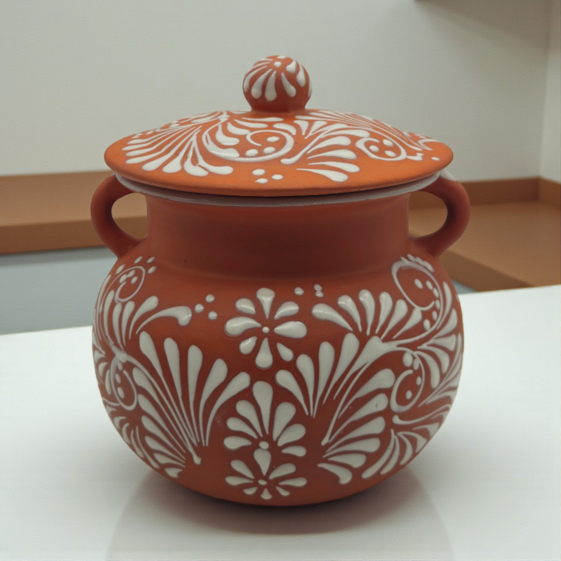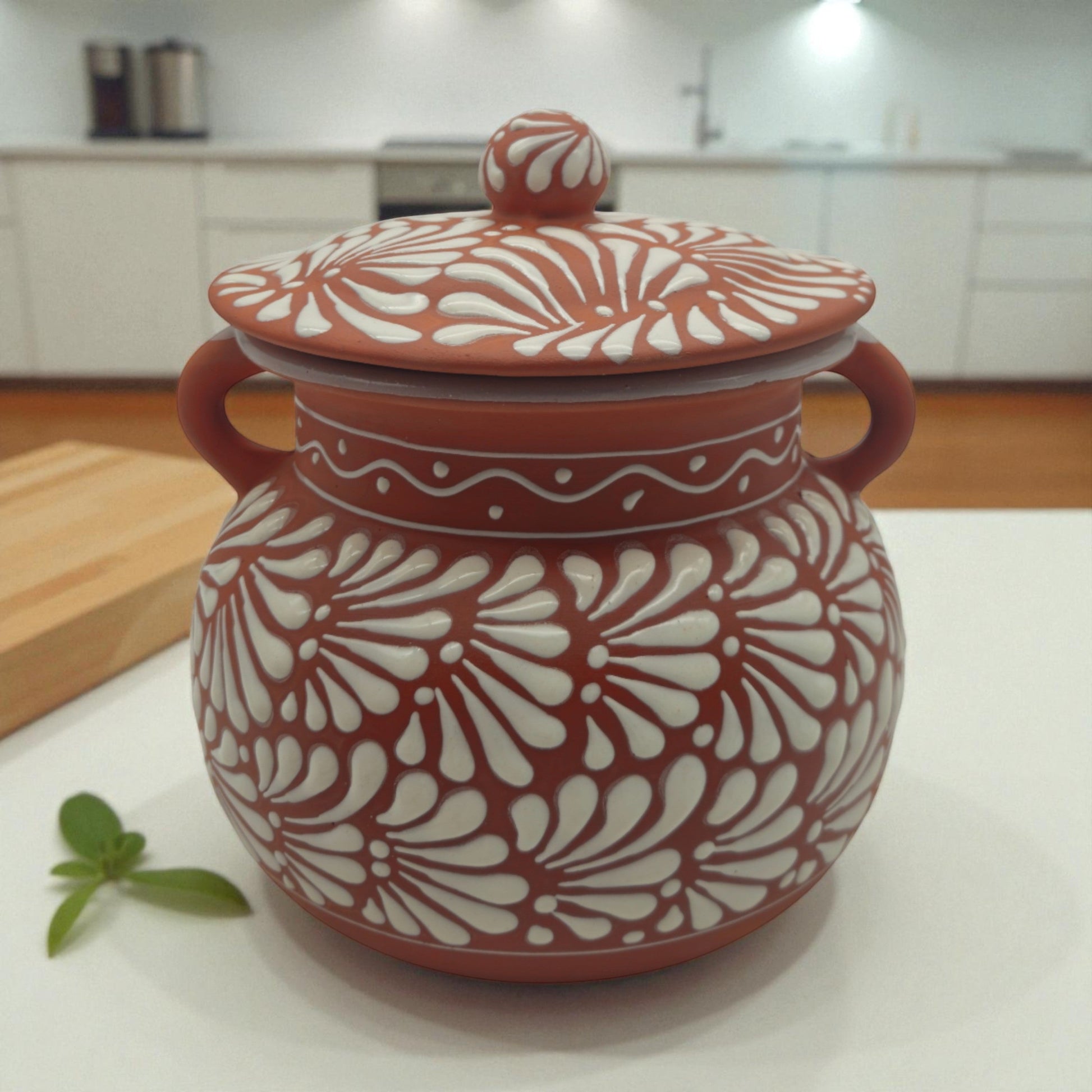 Style: This brown and white Talavera frijolero features a floral-inspired pattern with a matte exterior and glossy glazed interior. Its classic rounded shape and handled lid make it perfect for both functional and decorative use—ideal as a soup pot, centerpiece, or even a flower pot.