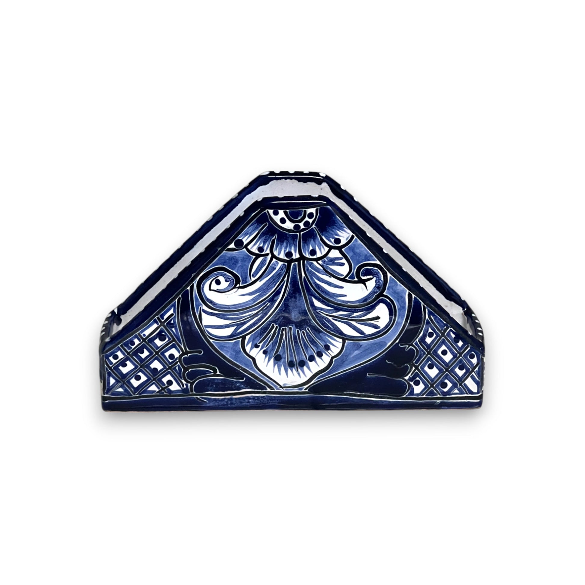 STYLE: Features traditional Talavera floral motifs in a striking cobalt blue and white finish. The triangular shape adds unique flair to functional decor.
