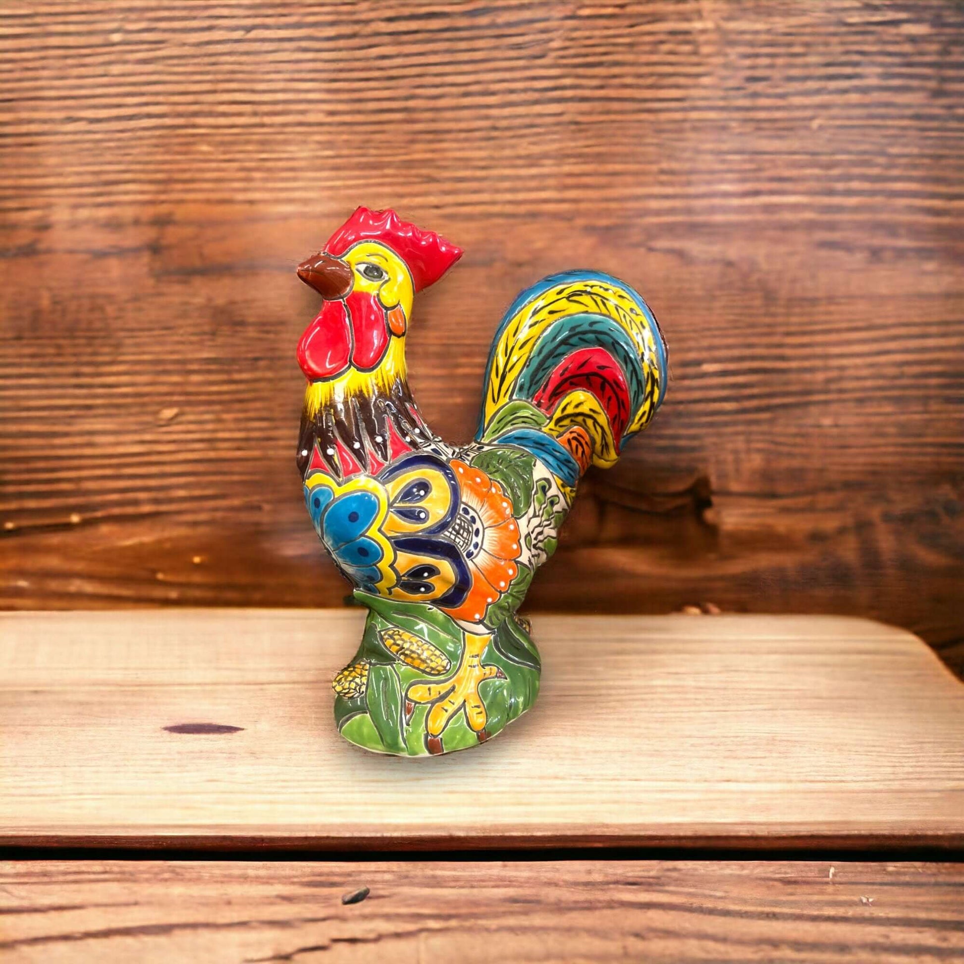 STYLE: This colorful rooster sculpture showcases classic Talavera flair with vibrant hand-painted feathers, intricate floral patterns, and lively tones of red, green, yellow, blue, and orange. It's a cheerful centerpiece that radiates personality and warmth.